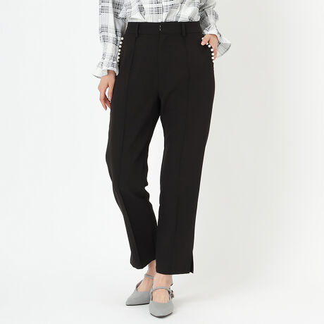 ポケットを縁取るパールが華感を演出するストレートパンツ。センターラインのピンタックも縦感を強調し、脚をすらっとした印象にみせてくれます。裾のサイドにはスリットが入っており、足元に軽やかなヌケ感をプラス。お仕事や休日のお出かけなどのあらゆるシーンにも活躍してくれるアイテムです。■fabric透け感[無し]裏地[無し]伸縮性[やや有り]生地の厚さ[普通]ウエストゴム[有り]ファスナー[有り]ポケット[有り]