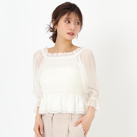 パールのような上品な輝きのシフォンでフェミニンな雰囲気を演出するブラウス。くしゅくしゅとしたシャーリングが豊かな表情をプラス。ふんわりとした裾のフリルやシアースリーブも女性らしさを一層引き立たせてくれます。カジュアルなデニムと合わせても愛らしいコーデに決まるアイテムです。■fabric透け感[有り]裏地[無し]伸縮性[有り]生地の厚さ[薄手]