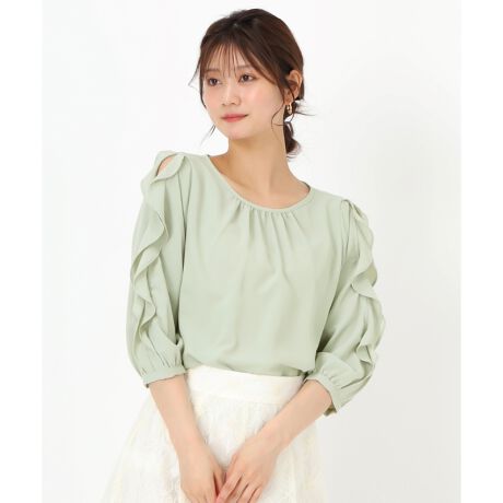 ラッフルフリルの袖開きデザインがエレガントなブラウス。ちらりとした肌見せ感で、女性らしさも一層高めてくれます。ふんわり柔らかなシルエットもフェミニンな雰囲気を演出。装いも華やかに魅せてくれるアイテムです。■fabric透け感[やや有り]裏地[無し]伸縮性[無し]生地の厚さ[薄手]