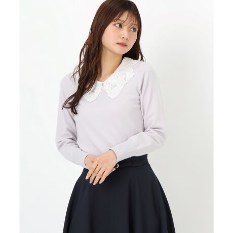 レース刺しゅうの襟が女性らしさを引き立たせるニット。袖口はリブ切り替えを施しており、フィット感のある着心地を実現します。バックにあしらわれたパール調ボタンがワンポイントに。ボトムスにタックインしたコーディネートがおすすめです。■fabric透け感[無し]裏地[無し]伸縮性[有り]生地の厚さ[普通]