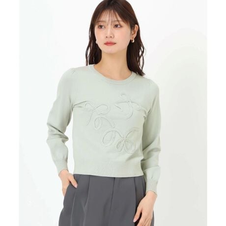 リボンモチーフのコード刺しゅうがガーリーなムードを高めるニット。丸みのあるクルーネックになっており、やわらかい印象を演出します。あらゆるボトムスと合わせやすく、コーディネートの幅が広がるアイテムです。■fabric透け感[無し]裏地[無し]伸縮性[有り]生地の厚さ[普通]