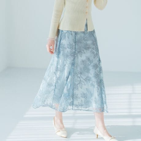 きらきらとしたラメフラワー刺しゅうが華やかなムードを演出するスカート。透け感のある生地をレイヤードすることで、さりげない女性らしさをプラスします。動くたびに揺らめくフレアシルエットが魅力的なアイテムです。■fabric透け感[有り]裏地[すべて有り]伸縮性[無し]生地の厚さ[薄手]ウエストゴム[有り]ファスナー[有り]ポケット[無し]