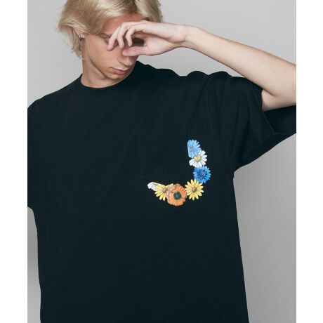 ポケットの角の部分を囲むように発色のいいシルクプリントで花柄をプリントしたカットソーです。プリントは国内の工場で1枚ずつ丁寧に加工を施しております。シルエットは身幅と肩幅を広めに取ったワイドシルエットで男女問わずゆったりとした着こなしが楽しめます。