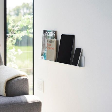 タブレットPCや本を石こうボードピンで壁に浮かせて収納できるスリムな棚。