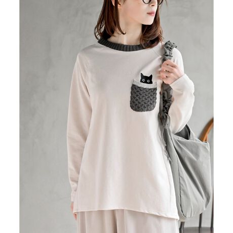 猫ちゃん刺繍がポイントのカジュアルトップス