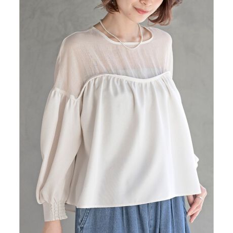 切り替え部分にたっぷりのギャザーをあしらってふんわり女性らしい雰囲気に。