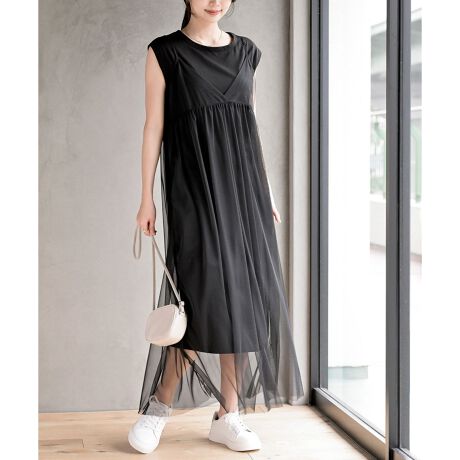 カットワンピースにチュールのキャミワンピを重ねたおしゃれなレイヤードが楽しめるアイテム。