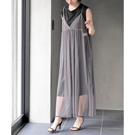 カットワンピースにチュールのキャミワンピを重ねたおしゃれなレイヤードが楽しめるアイテム。