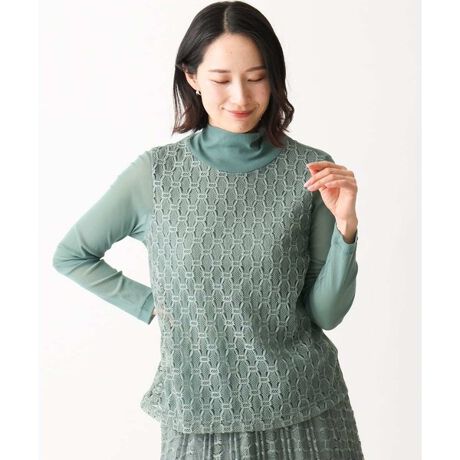 [洗える・日本製]66ナイロンチュールクロシェ風レースカットソー