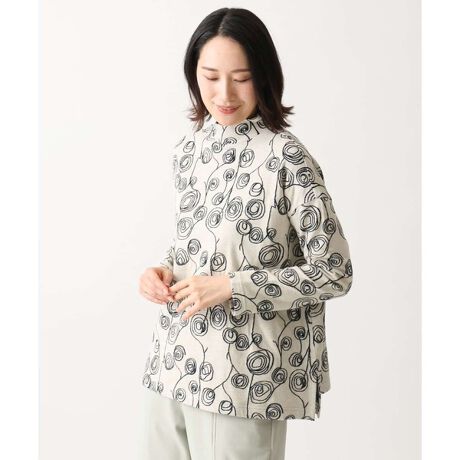 一筆描きのような絵画をイメージした、線描きタッチの花柄を表現したジャージープルオーバーです。首元はすっきりと見えるプチハイネックデザイン。身体のラインをひろいすぎない緩やかなシルエットに仕上げ、サイドには、深めのスリットが入れることでリラクシーながら、上品見えするデザインに仕上げました。