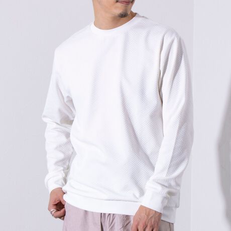 程よいハリ感としなやかさを併せ持つリンクスの生地に、全体にデザインを巡らせることで品よく印象付けたクルーネック長袖Tシャツ。
