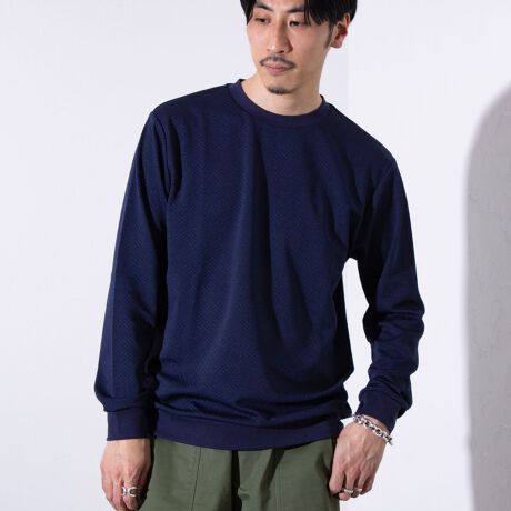 程よいハリ感としなやかさを併せ持つリンクスの生地に、全体にデザインを巡らせることで品よく印象付けたクルーネック長袖Tシャツ。