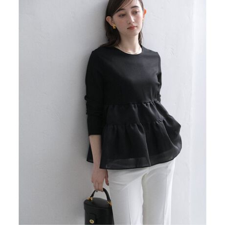 ペプラムはシアー素材で切り替えることで、腰位置を高く見せ、間延びしないメリハリのある着こなしが叶います。