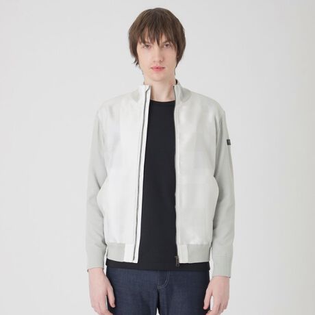 前身頃には布帛のシャドーチェック、後身頃と袖にはニットを使用したファブリックコンビのニットブルゾン。フロント・ニットともに、程良い薄さに仕上げる事で3シーズン着用できるアイテムに仕上げています。ニットのストレッチ性を兼ね備えたこのブルゾンは羽織りとしてはもちろん、コートやジャケットのミッドレイヤードアイテムとしても活躍するアイテムです。