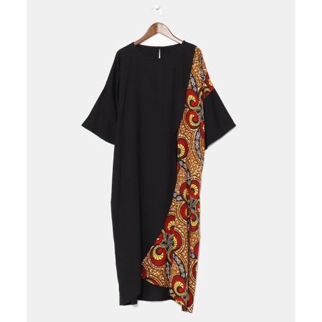 [型番:IAC-5131-2025]アフリカのキテンゲモチーフの柄を使用した、無地×柄の切り替えが楽しいワンピース。サイドの紐を絞ってシルエットの変更が可能。レーヨン素材でさらっと着られる一着。ラフィキはスワヒリ語で「友達」という意味。