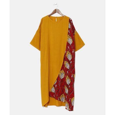 [型番:IAC-5131-2025]アフリカのキテンゲモチーフの柄を使用した、無地×柄の切り替えが楽しいワンピース。サイドの紐を絞ってシルエットの変更が可能。レーヨン素材でさらっと着られる一着。ラフィキはスワヒリ語で「友達」という意味。