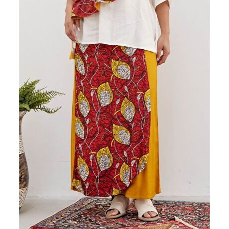 アフリカのキテンゲモチーフの柄を使用した、無地×柄の切り替えが楽しいラップパンツ。巻きスカート風のシルエットで、柄と無地の前後2WAYで楽しめる。レーヨン素材でさらっと着られる一着。ラフィキはスワヒリ語で「友達」という意味。