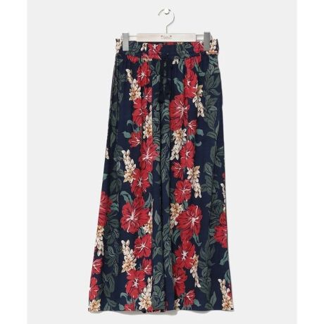 [型番:4IA-5103-2025]ヴィンテージ感のあるハイビスカス柄をプリントしたワイドパンツ。素肌に心地よいレーヨン素材です。華やかなデザインでありながら落ち着いた色味のパンツで、普段使いにもコーディネートの主役にもなれる一枚。