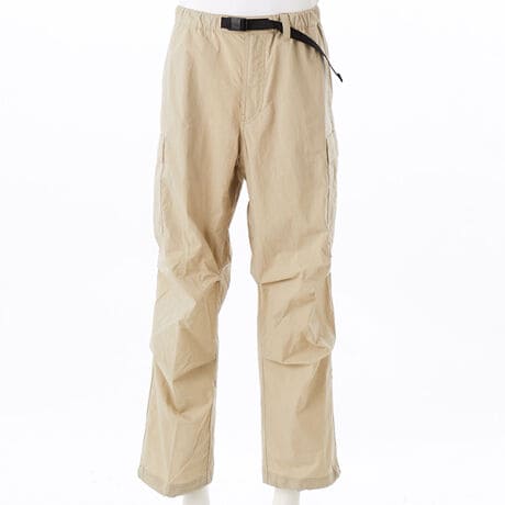 スパンナイロン糸を使用し、ナチュラルな雰囲気を追求したカーゴパンツ。経糸にスパンナイロン糸、緯糸にフィラメントを使用したリップストップ生地は、光沢を抑えたマットな生地感が特徴で、天然素材のようなナチュラルな風合い。独特のシワ感がレトロな雰囲気をかもし出します。生地にはっ水加工を施し、多少の雨に対応。両サイドにカーゴポケット、ヒップにもフラップ付きポケットを配置し、収納力を高めています。ウエストはウェビングベルト仕様。時流に合わせたゆとりのあるサイジングで、カジュアルな着こなしが楽しめるアイテムです。
