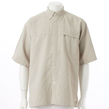 高通気とUVカットを両立したリネン調の機能素材を採用した「Awning」コレクションの半袖シャツ。ワッフル調の生地は肌離れがよく、通気性のよさも特徴。光の透過を抑えるセラミック粒子の含有質を高めた糸を使用することで、UPF値と遮熱性を高めています。糸にリネン調の加工を施すことで、ポリエステルでありながら、天然素材のようなナチュラルな風合いを実現。吸水加工により、乾きやすさも備えています。UVプロテクト(UPF50+、紫外線カット率95%以上)機能付き。左胸には小物類の収納に便利なファスナー付きポケットを配置しています。シンプルなデザインのボタンダウンシャツは、リラックスして着用できる、ゆとりのあるシルエット。高温多湿な夏の都市生活を快適に過ごすための機能に、デザイン性を兼ね備えたアイテムです。