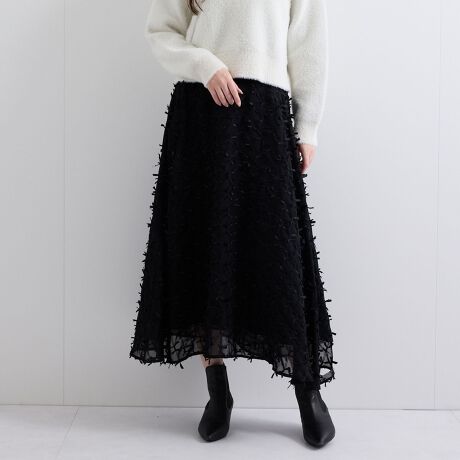 リボンを織り込んだように立体的に表現された華やかなテキスタイルを使用したシフォンスカート。