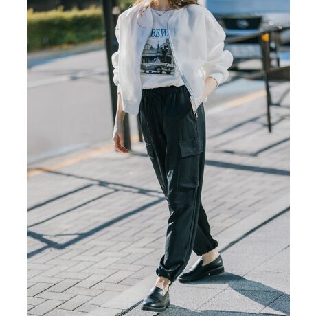 シックなサテン生地が魅力で、カジュアルにもエレガントにもコーディネートしやすいパンツです。裾部分にはスピンドルが付いており、自由に絞ってお好みのシルエットに調整可能。動きやすさとスタイルを両立させたデザインは、日常のどんなシーンでも活躍します。ワイドなシルエットでもウエスト部分はゴムと調節の出来るひも付きになるので、履き心地もいいカーゴパンツです。