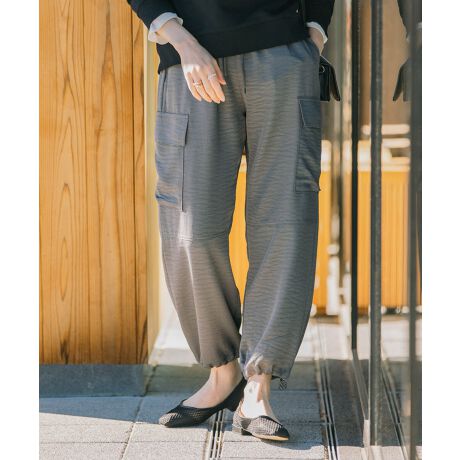シックなサテン生地が魅力で、カジュアルにもエレガントにもコーディネートしやすいパンツです。裾部分にはスピンドルが付いており、自由に絞ってお好みのシルエットに調整可能。動きやすさとスタイルを両立させたデザインは、日常のどんなシーンでも活躍します。ワイドなシルエットでもウエスト部分はゴムと調節の出来るひも付きになるので、履き心地もいいカーゴパンツです。