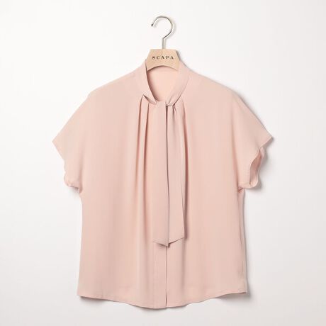 柔らかで軽やかなタッチのツイル素材を用いたブラウス。半袖ながらも首元にボウを添えることで、きちんとした印象に仕上げています。フロントボタンが隠れた比翼仕立てを採用しており、エレガントな表情。裾をボトムスにインする着こなしもバランスよくまとまります。綺麗な落ち感で、華やかなシーンにも最適。