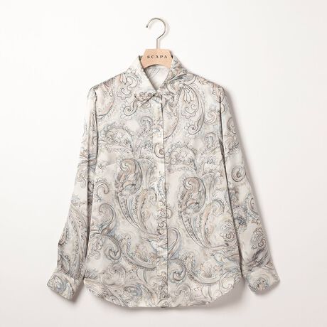 軽やかで優美な動きを持つポリエステル素材を用いたブラウスです。手描きタッチのペーズリー柄を載せ、絵画のように美しく仕上げています。ゆったりとしすぎず、ジャケットなどを上から羽織りやすいデザイン。量感のあるボトムスに裾をインして楽しむ着こなしもおすすめです。綺麗な発色のアイテムとも好相性。