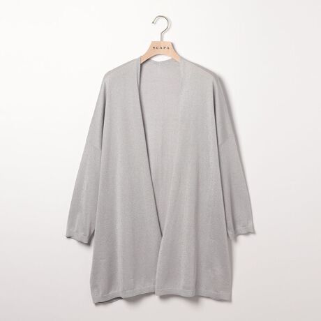 上品な光沢と透け感のあるニット素材を用いたカーディガンです。ヒップが隠れる程度の着丈と留め具のないデザインで、エレガントな表情に仕上げています。肩まわりに程良いゆとりがあり、Tシャツなどの上からも羽織りやすい仕立て。オンオフ問わず、多彩なシーンに活躍する洗練度の高いアイテムです。