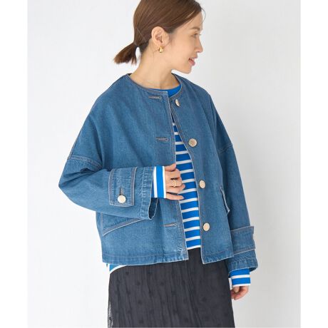カジュアルなデニム素材を女性らしいフォルムで仕立てた『HUMBIE NO COLLAR JACKET DENIM』