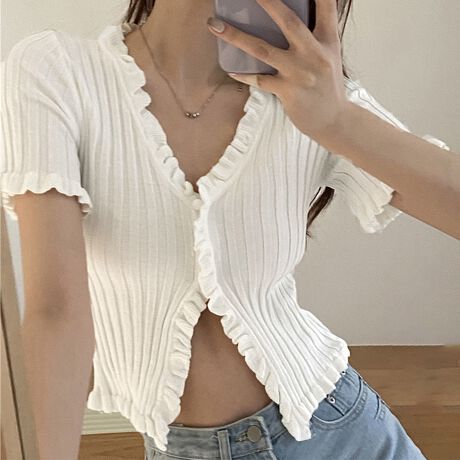 フリルリブニットレディース Vネック薄手