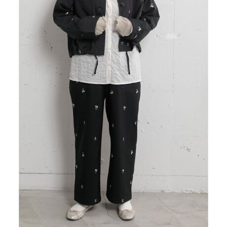 オリジナルの花モチーフを刺繍した、ストレートでややワイドなシルエットのペインターパンツ。シンプルなスタイルのアクセントになるアイテムです。ウエストはぐるりゴム、フロントのファスナーあきでヒップ周りを少しすっきりさせました。両サイドポケットあり。