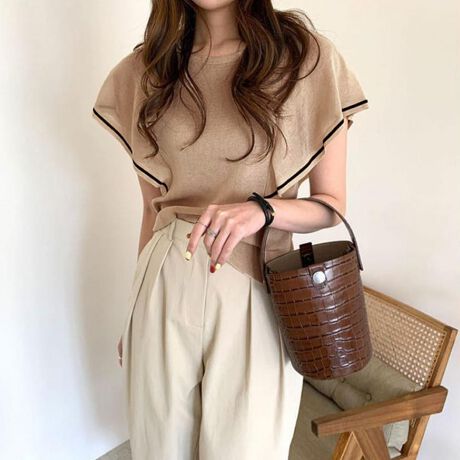 縁取るように細かめのラインを仕込んだ見た目が爽やかなバイカラーニットトップス