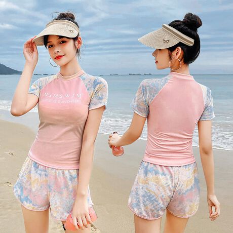 露出度が控えめで紫外線から肌を守ってくれるラッシュガード仕様の新作水着上下2点セット