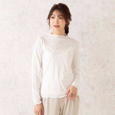 柔らかな肌触りで伸縮性も軽やかな素材はレイヤードしてもごわつかず、すっきりとしたコンパクトなシルエットでも着やすいアイテム。