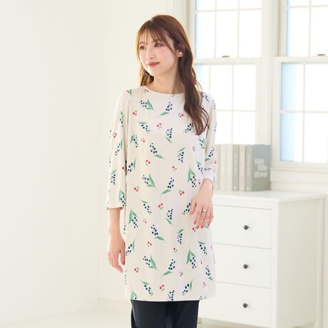 スズランのプリント柄が可愛いスムース素材のチュニック丈ワンピース。