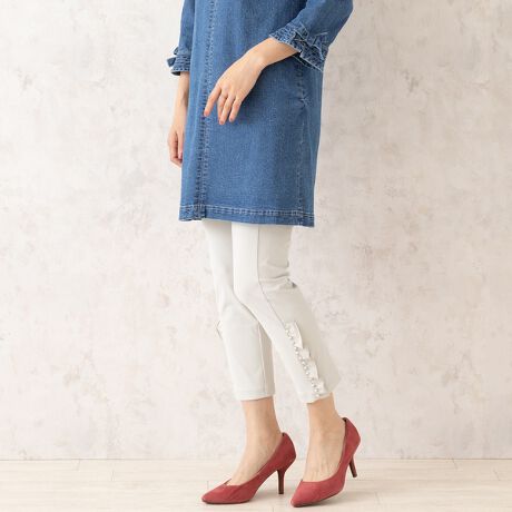 脚のラインに沿ってフィットしてくれる、伸縮性抜群の美脚パンツはスリムなシルエットで、微光沢のある上質な素材ではくだけで上品な印象に。