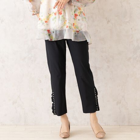 脚のラインに沿ってフィットしてくれる、伸縮性抜群の美脚パンツはスリムなシルエットで、微光沢のある上質な素材ではくだけで上品な印象に。