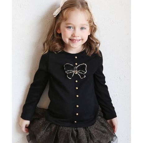 女の子 キッズ 長袖 Tシャツ 通販 ロンT 63052302 長袖Tシャツ カットソー リボン フェイクボタン おしゃれ かわいい オシャレ 可愛い 黒 ブラック 春 秋 冬 こども 女子 小学生 通学 トップス 子ども服 子供服 キッズファッション