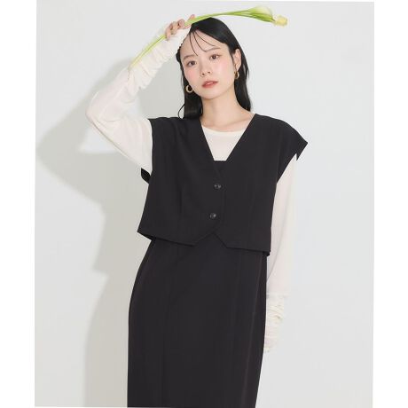 春の上品なコーディネートが決まるセット2点アイテム。コンパクトなベストに軽やかテキスタイルのキャミソールワンピースを合わせました。きれいめデザインながらも、ウエスト部分やバックにゴムを使用することで動きやすくストレスフリーな着心地に。インナーにTシャツを合わせてカジュアルダウンした普段使いに、ブラウスやシアートップを合わせたお呼ばれスタイルにも最適なアイテムです。