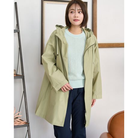 ミドル丈のモッズ風アウターです。裏なしの軽い羽織りでゆったりとしたサイズ感がニュアンスのあるシルエットです。フード周りにグログランテープを施してアクセントにしています。後身頃のテープを絞って動きのあるスタイルにすると、より女性らしく着用して頂けます。