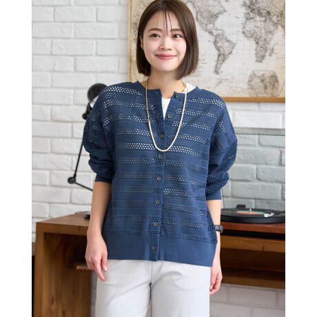 前後どちらでも着用でき2wayデザインのトップスです。ボタンがある側を前にして着るとカーディガンとしても楽しめます。トレンド感のある透けレースジャカードでインナーカラーを配色にしてもコーディネートを楽しめるアイテムです。