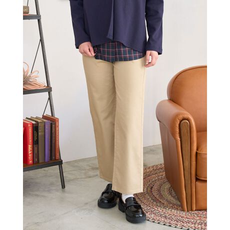 [型番:467R3701]横にテンションのある綿ポリエステル素材を使用したストレートパンツです。ウエストは後ろのみ平ゴムを入れ、伸びる仕様にしています。モデル身長:167cm 着用サイズ:61サイズ