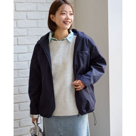 綿ポリエステルのグログランタフタを使用したマウンテンパーカです。ポリエステルは再生ポリエステルを使用してます。裏無しの一枚仕立てで、ファスナー開き、フードは取り外し可能です。後ろヨークの襟ぐりに身頃と同色のロゴ刺繍が入ります。裾のゴム紐を絞って頂くと分量のあるボトムとも合わせ易いです。