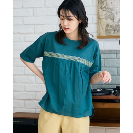 切り替え部分にカラー配色のスモッキングを施したデザイントップスです。天竺と布帛の2種の素材を使用しているのもシルエットに遊びが出るのでポイントになっています。オーガニックコットンを使用しています。