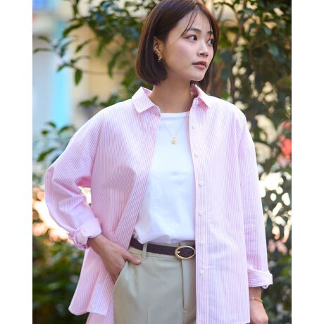 3mmほどのストライプは鮮やかな色糸をセレクトし白糸と交差することで優しい発色に変化し、暖かい春風に寄り添うシャツに仕上がりました。ナチュラルでホームケアしやすい素材ですが、ほのかに艶感もあるため砕けすぎずジュエリーを添えてオフィスでの着用も素敵です。Tシャツにタスキがけしたり腰に巻いたアレンジで運動会やデイキャンプでの着用も◎少し大きめに付けた両脇の三角パーツがチャーミングな1着。