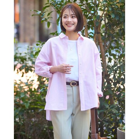 3mmほどのストライプは鮮やかな色糸をセレクトし白糸と交差することで優しい発色に変化し、暖かい春風に寄り添うシャツに仕上がりました。ナチュラルでホームケアしやすい素材ですが、ほのかに艶感もあるため砕けすぎずジュエリーを添えてオフィスでの着用も素敵です。Tシャツにタスキがけしたり腰に巻いたアレンジで運動会やデイキャンプでの着用も◎少し大きめに付けた両脇の三角パーツがチャーミングな1着。