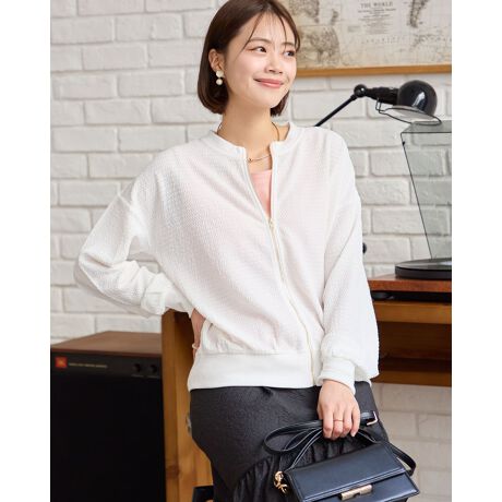 ぷくぷくした凹凸感のあるサッカー調の生地で、凹凸と交互に並ぶ小さなスクエアの編み地部分にシアー感のある涼しげな素材をセレクト。四方のテンションに優れているためシワになりにくい点もポイントです。フロントにメタルのファスナーをあしらったシャープな印象のカーディガン。襟や袖裾部分をリブで切り替えているため、スタイルにメリハリが出やすくフロントを開け、袖をたくし上げて羽織るスタイルも素敵です。