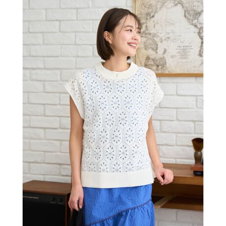 ボディ全体に10cmほどの大きさで編まれたダイヤの透かしが華やかなニットベスト。ほのかな艶感でナチュラルになり過ぎず地金のジュエリーやキレイめなボトムスと合わせてオフィスでの着用も◎ボディのシアー感に反し、少し詰まったネックラインが肌の露出を抑え品の良さがうかがえる点もポイント。軽いハイゲージで気温に応じてインナーを長袖から半袖、タンクトップと変化させノースリーブスタイルでお召しになっても素敵です。